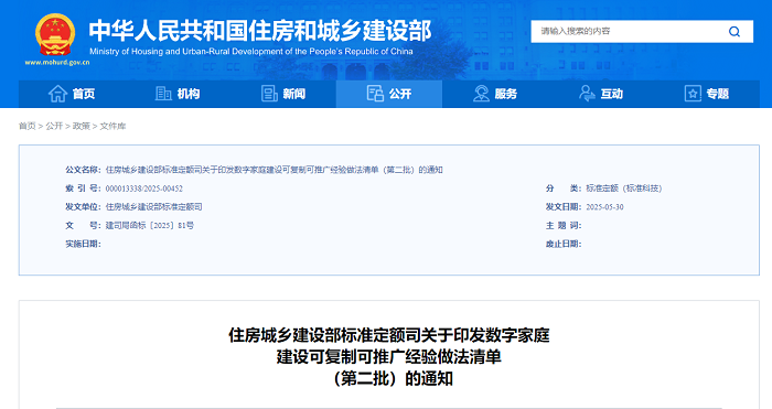 根据《住房城乡建设部办公厅  工业和信息化部办公厅关于开展数字家庭建设试点工作的通知》要求,为指导各试点地区科学有序建设数字家庭,加强试点示范宣传推广,住房城乡建设部标准定额司根据各地报送的2024年工作总结并结合调研情况,梳理形成了《数字家庭建设可复制可推广经验清单(第二批)》。